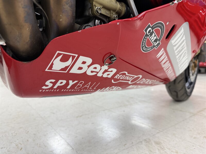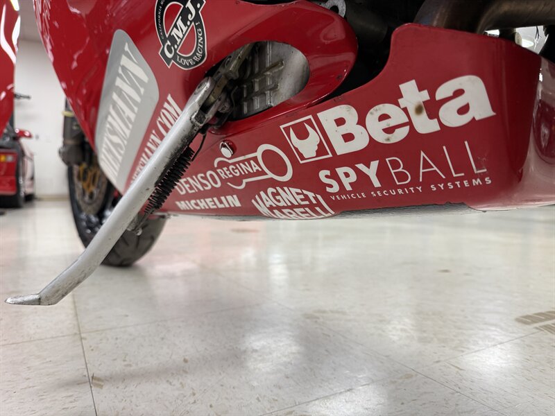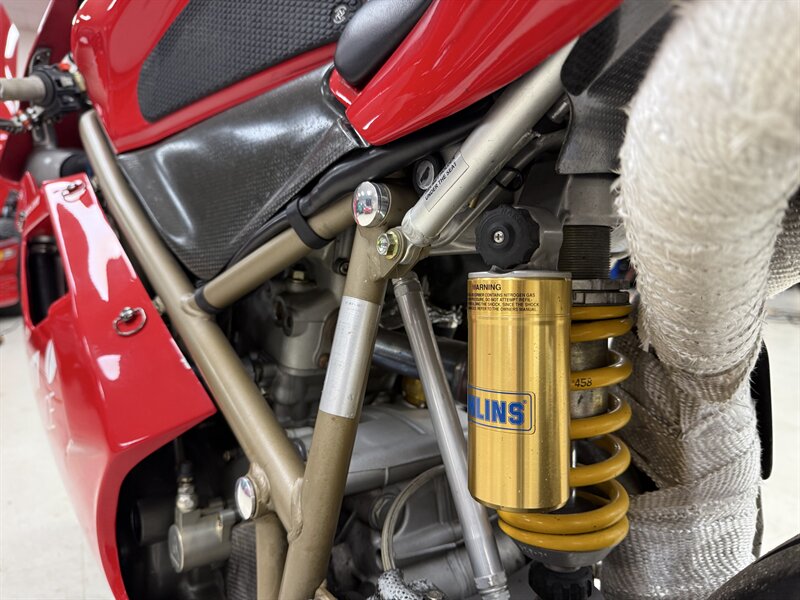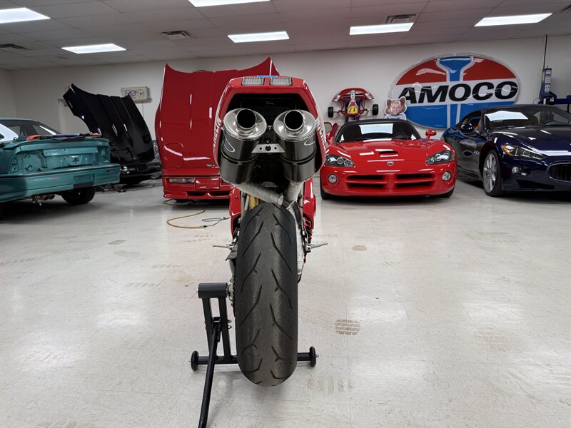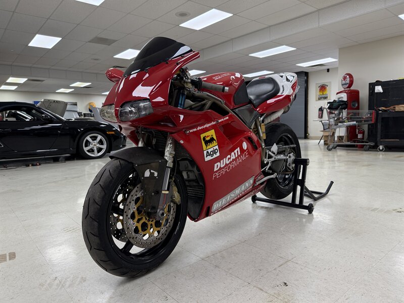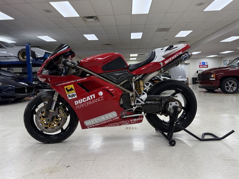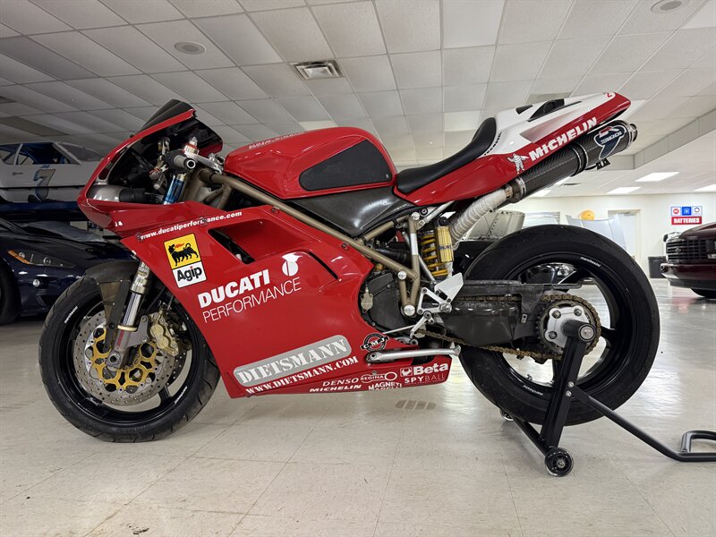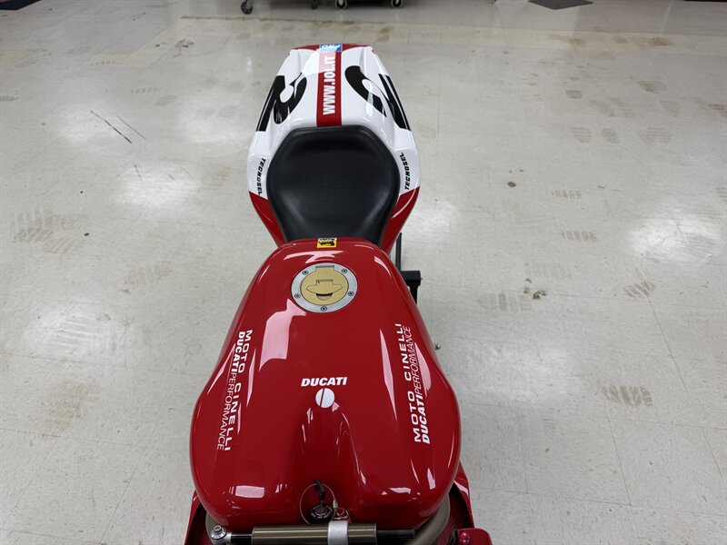 1999 DUCATI 996S MONOPOSTO - NUMBER 108 OF 201 996S' BROUGHT TO THE UNITED STATES IN 1999 - 16,241 MILES - 996CC FUEL INJECTED 90 DEGREE L-TWIN WITH 112 HORSEPOWER @8,500 RPM - 4 VALVE DESMODROMIC CYLINDER HEADS - 6-SPEED SEQUENTIAL MANUAL - TUBULAR STEEL TRELLIS FRAME WITH ALUMINUM REAR SUBFRAME - HYDRAULICALLY ACTUATED EXTERNAL DRY-CLUTCH - SINGLE SIDED REAR SWINGARM - MARCHESINI 5-SPOKE WHEELS WITH PIRELLI DIABLO CORSA ROSSO TIRES - BREMBO TRIPLE DISC BRAKES - SHOWA ADJUSTABLE FRONT SUSPENSION - OHLINS ADJUSTABLE REAR SUSPENSION - DUCATI PERFORMANCE "STAGE 1" COMPUTER CHIP MODIFICATION - TERMIGNONI DUAL-CAN CARBON FIBER EXHAUST - FULL CARBON FIBER AIRBOX - CARBON FIBER FRONT FENDER - CARBON FIBER CHAIN GUARDS - CARBON FIBER EXHAUST HEADER GUARD - SHARKSKINS FIBERGLASS RACE FAIRINGS PAINTED IN CARL FOGARTY LIVERY - DUCATI NORTH AMERICA TOLD US IT IS AN ORIGINAL 996S BUILT ON MARCH 1st 1999 WITH ITS ORIGINAL NUMBER BEING SB5X005505 - REAR PADDOCK STAND IS INCLUDED WITH THE SALE - THIS BEAUTIFUL DUCATI SUPERBIKE IS IN OUR INDOOR CLIMATE-CONTROLLED SHOWROOM, NATIONWIDE SHIPPING IS AVAILABLE - FOR MORE DETAILS OR TO SCHEDULE A VIEWING, PLEASE CALL 810-487-2020
