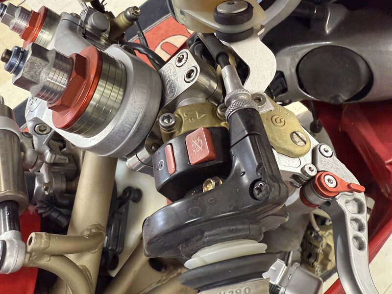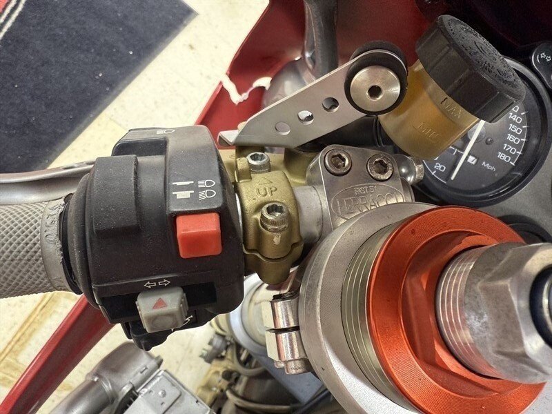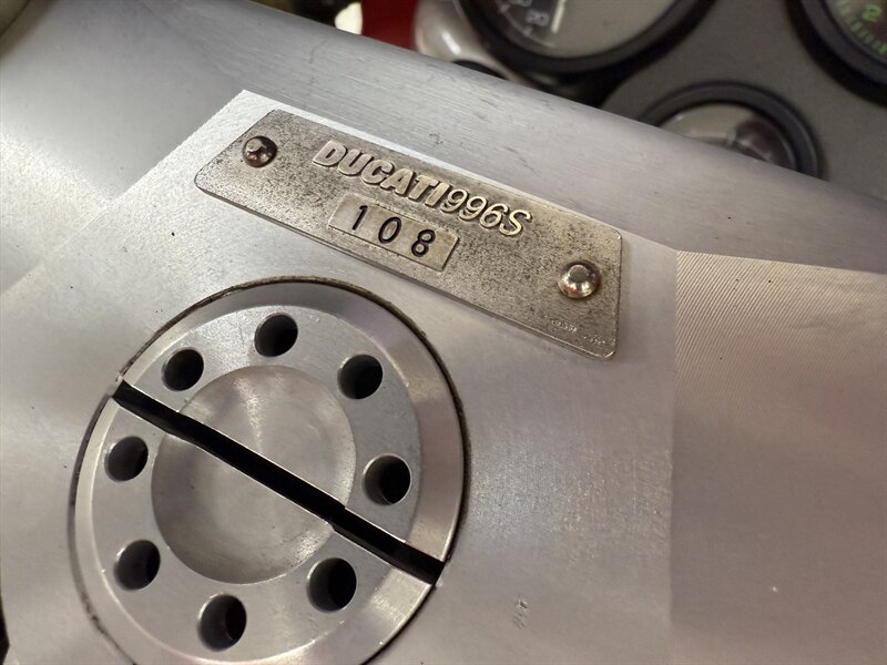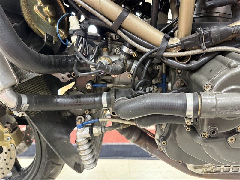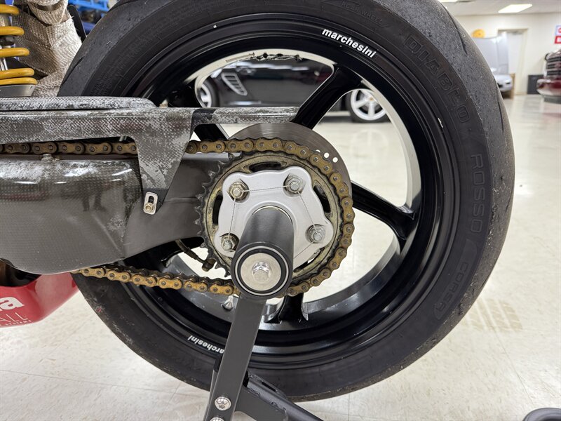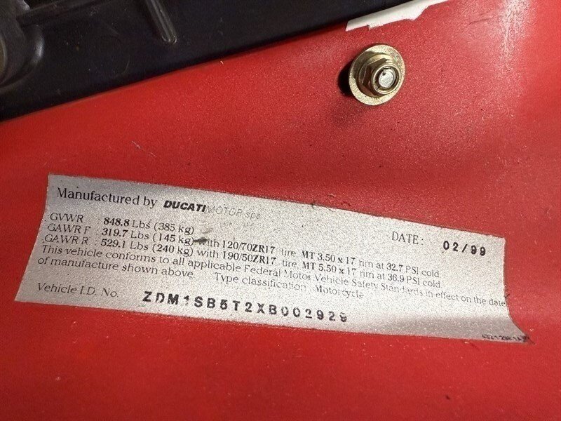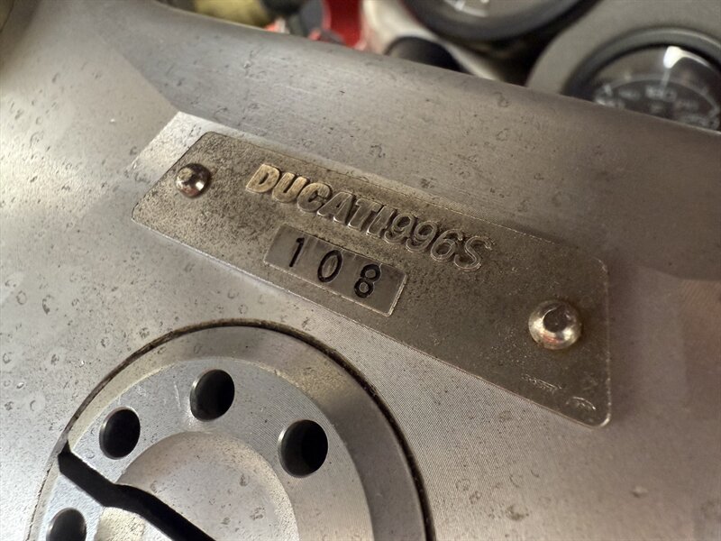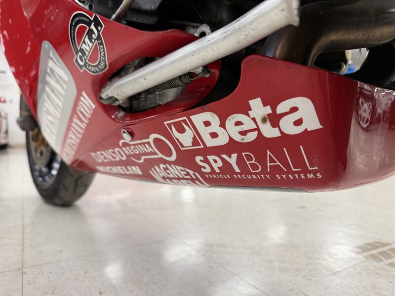1999 DUCATI 996S MONOPOSTO - NUMBER 108 OF 201 996S' BROUGHT TO THE UNITED STATES IN 1999 - 16,241 MILES - 996CC FUEL INJECTED 90 DEGREE L-TWIN WITH 112 HORSEPOWER @8,500 RPM - 4 VALVE DESMODROMIC CYLINDER HEADS - 6-SPEED SEQUENTIAL MANUAL - TUBULAR STEEL TRELLIS FRAME WITH ALUMINUM REAR SUBFRAME - HYDRAULICALLY ACTUATED EXTERNAL DRY-CLUTCH - SINGLE SIDED REAR SWINGARM - MARCHESINI 5-SPOKE WHEELS WITH PIRELLI DIABLO CORSA ROSSO TIRES - BREMBO TRIPLE DISC BRAKES - SHOWA ADJUSTABLE FRONT SUSPENSION - OHLINS ADJUSTABLE REAR SUSPENSION - DUCATI PERFORMANCE "STAGE 1" COMPUTER CHIP MODIFICATION - TERMIGNONI DUAL-CAN CARBON FIBER EXHAUST - FULL CARBON FIBER AIRBOX - CARBON FIBER FRONT FENDER - CARBON FIBER CHAIN GUARDS - CARBON FIBER EXHAUST HEADER GUARD - SHARKSKINS FIBERGLASS RACE FAIRINGS PAINTED IN CARL FOGARTY LIVERY - DUCATI NORTH AMERICA TOLD US IT IS AN ORIGINAL 996S BUILT ON MARCH 1st 1999 WITH ITS ORIGINAL NUMBER BEING SB5X005505 - REAR PADDOCK STAND IS INCLUDED WITH THE SALE - THIS BEAUTIFUL DUCATI SUPERBIKE IS IN OUR INDOOR CLIMATE-CONTROLLED SHOWROOM, NATIONWIDE SHIPPING IS AVAILABLE - FOR MORE DETAILS OR TO SCHEDULE A VIEWING, PLEASE CALL 810-487-2020