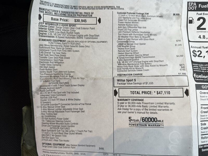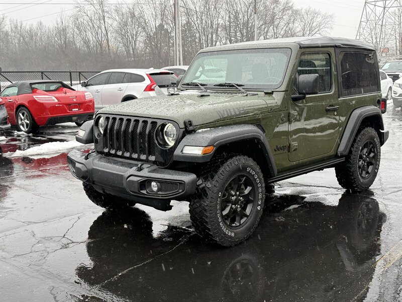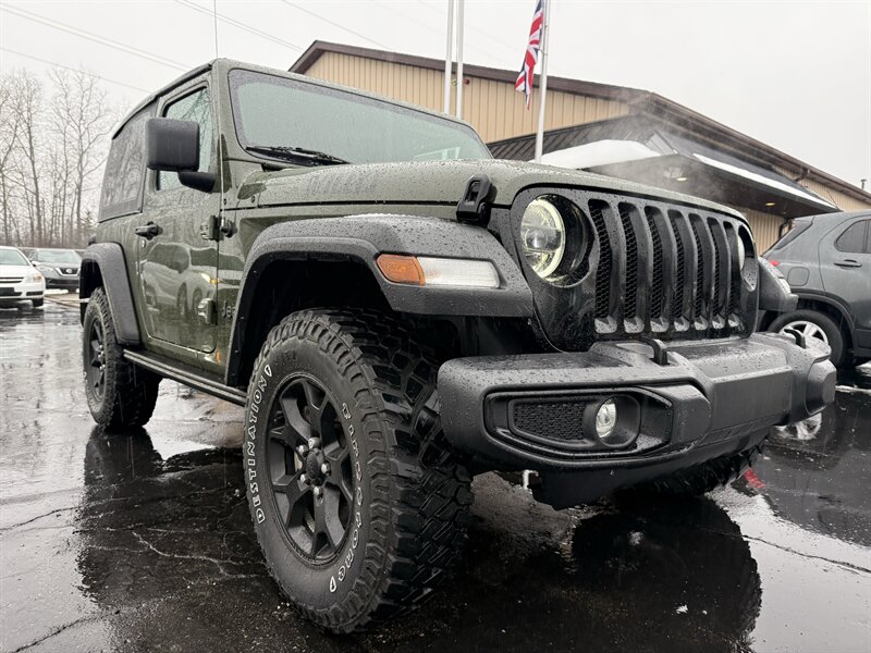 2023 JEEP WRANGLER 2-DOOR SPORT WILLYS - 3.6 LITER VVT eTORQUE V6 ENGINE - 8-SPEED 850RE AUTOMATIC TRANSMISSION WITH SELEC-SPEED CONTROL - COMMAND-TRAC PART TIME 4X4 SYSTEM WITH LOW RANGE CAPABILITY - DANA M186 FRONT AXLE - DANA M220 REAR AXLE - 3.45 RATIO - REAR ANTI-SPIN DIFFERENTIAL - FUEL TANK, TRANSFER CASE, AND TRANSMISSION SKID PLATES - MOPAR HEAVY DUTY ROCK SLIDER SIDE STEPS - 17 INCH MOAB ALLOY WHEELS WITH 255/75R17 FIRESTONE DESTINATION MT TIRES - SARGE GREEN EXTERIOR WITH BLACK SUNRIDER SOFT TOP - BLACK CLOTH LOW BACK BUCKET SEATS - AUTOMATIC CLIMATE CONTROL WITH AIR CONDITIONING - POWER WINDOWS - POWER LOCKS - KEYLESS ENTRY AND IGNITION - FACTORY REMOTE START - FULL SIZED SPARE - LEATHER WRAPPED STEERING WHEEL WITH AUDIO AND CRUISE CONTROLS - HEATED FRONT SEATS AND STEERING WHEEL - 8-SPEAKER SOUND SYSTEM - 7 INCH UCONNECT TOUCHSCREEN INFOTAINMENT - MOPAR GRAB HANDLES - MOPAR ALL WEATHER FLOOR LINERS - LED PREMIUM REFLECTOR HEADLAMPS - LED FOG LAMPS - FACTORY POWERTRAIN WARRANTY IN EFFECT UNTIL 1031/2027 OR 60,000 MILES - BOTH KEYS AND ALL MANUALS - THIS TRAIL RATED WILLYS EDITION WRANGLER LOOKS AND DRIVES GREAT AND IS READY TO GO ANYWHERE - FOR MORE DETAILS OR TO SCHEDULE A TEST DRIVE, PLEASE CALL 810-487-2020